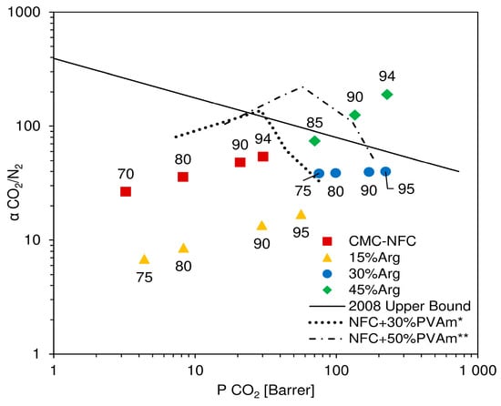 In Figure 10, results of the described procedure are reported in a Robeson plot, where experimental data are presented together with the indication of the relative humidity considered for calculation. In the chart, CMC-NFC clearly showed an incremental trend of ideal selectivity, along with permeability, which was also observed in a previous work [] for a similar material. In particular, selectivity values ranged from 25 to 56, which represented good separation factors, but still coupled with relatively low permeabilities. Once a small amount of amino acid was introduced (15 wt.%), selectivity values appeared to decrease quite significantly, varying from 4–10 as already expected from the analysis of CO2 and N2 selectivity variation.