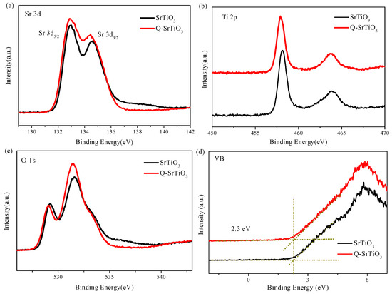 XPS was used to investigate the surface chemical composition and VB position of SrTiO3 and Q-SrTiO3. The Sr 3d5/2, Sr 3d3/2, Ti 2p1/2, and Ti 2p3/2 binding energies were 133.2, 134.6, 458.0, and 464.0 eV, respectively, in accordance with the literature values (Figure 4a,b) [35]. The Sr 3d and Ti 2p spectra showed no obvious variation between SrTiO3 and Q-SrTiO3. The Sr/Ti ratio of the samples was estimated according to the peak area and sensitivity factor of Sr 3d and Ti 2p (Table 1). The atomic ratio of Sr to Ti on the surface was about 1.64 and 2.15 for SrTiO3 and Q-SrTiO3, respectively. The larger atomic ratio of Sr/Ti in Q-SrTiO3 than that in SrTiO3 might be due to the substitution of Sr2+ for Ti4+ on the surface of the former.