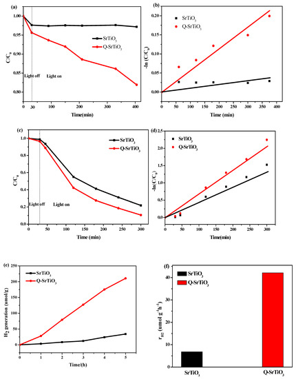 Photodecomposition of RhB aqueous solution with SrTiO3 and Q-SrTiO3 under visible light (a) and UV light (c). −ln (C/C0) of the RhB concentration as a function of visible light (b) or UV light (d) irradiation time. Time-course of photocatalytic water splitting for H2 generation in 100 mL 10% aqueous methanol solution under solar light (e). The rate of hydrogen generation for SrTiO3 and Q-SrTiO3 under solar light (f).