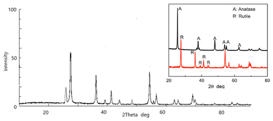 X-ray diffractogram of TiO2 from the commercial sunscreen with an average particle size of 43 nm (determined by XRD); inner image – XRD of rutile standard (R) and anatase standard (A).