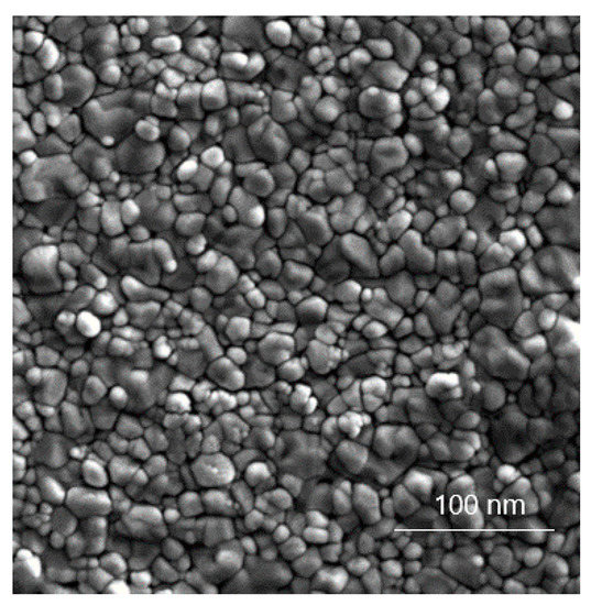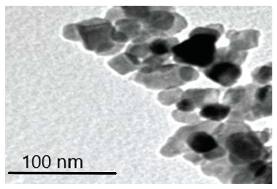 SEM analysis of the sunscreen is shown in Figure 2. The micrograph of TiO2 particles was taken after the separation of the cream matrix by extraction. The particle size distribution was determined as a monomodal distribution in a range of approximately 20–60 nm, with a global maximum of 32 nm. In agreement with XRD, the calculated average particle size was determined to be 43 nm.