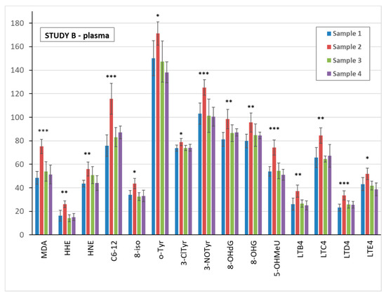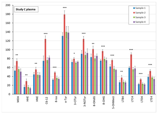 Comparison of the mean levels of oxidative stress and inflammatory markers in study B blood plasma pre-exposure (sample 1) and after ultra violet (UV) exposure (samples 2–4). * (p < 0.05) ** (p < 0.01) *** (p < 0.001). MDA = malondialdehyde, HHE = 4-hydroxy-trans-hexenal, HNE = 4-hydroxy-trans-nonenal, C6-12 = aldehydes C6-C12, (all ng/mL); 8-iso = 8-isoProstaglandin F2α, o-Tyr = o-tyrosine, 3-ClTyr = 3-chlorotyrosine, 3-NOTyr = 3-nitrotyrosine, 8-OHdG = 8-hydroxy-2-deoxyguanosine, 8-OHG = 8-hydroxyguanosine, 5-OHMeU = 5-hydroxymethyl uracil, and leukotrienes (LT) LTB4, LTC4, LTD4, LTE4 (all pg/mL).