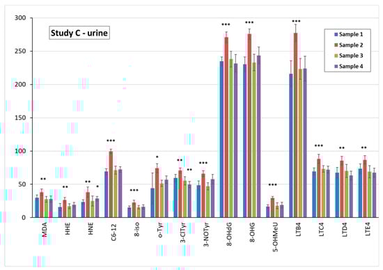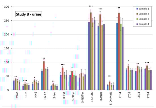 Comparison of the mean levels of oxidative stress and inflammatory markers in study B urine pre-exposure (sample 1) and after UV exposure (samples 2–4). * (p < 0.05) ** (p < 0.01) *** (p < 0.001). MDA = malondialdehyde, HHE = 4-hydroxy-trans-hexenal, HNE = 4-hydroxy-trans-nonenal, C6-12 = aldehydes C6-C12, (all ng/mL); 8-iso = 8-isoProstaglandin F2α, 8-OHdG = 8-hydroxy-2-deoxyguanosine, 8-OHG = 8-hydroxyguanosine, 5-OHMeU = 5-hydroxymethyl uracil, o-Tyr = o-tyrosine, 3-ClTyr = 3-chlorotyrosine, 3-NOTyr = 3-nitrotyrosine, leukotrienes (LT) LTB4, LTC4, LTD4, LTE4 (all pg/mL).