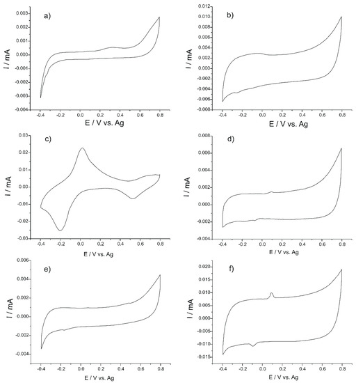 The first stage of the research was the registering of the cyclic voltammograms of all sensors in 0.1 M KCl solution, with a scan rate of 0.1 V × s−1. These CVs were used as reference signals for the sensor quality check (Figure S1—Supplementary Material).