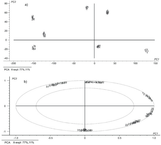 Figure 3 presents the PCA results in the form of two-dimensional graphs of the scores and loadings.