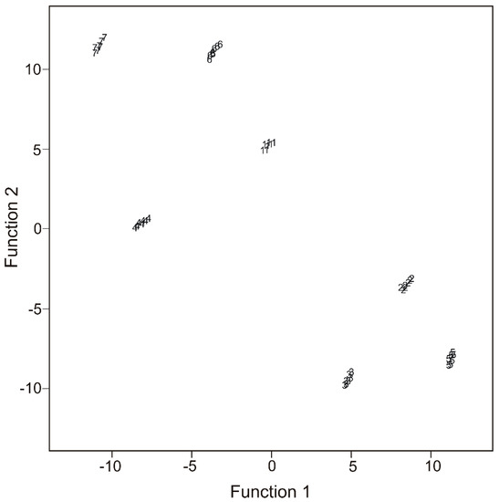 The Discriminant Factor Analysis (DFA) is a method based on looking for a direction along which the sample clusters are as far as possible and the samples of the same group are as close as possible. The results of the mathematical model may be represented in two or three dimensions. This method is usually used to identify and to classify unknown samples. In order to do this, an assignment function is used, which is based on the proximity of the sample to the gravity center of the group. The result of the classification is obtained by projecting the sample data on a 2D gradient of the two best discriminating functions in relation to the samples classification [40].