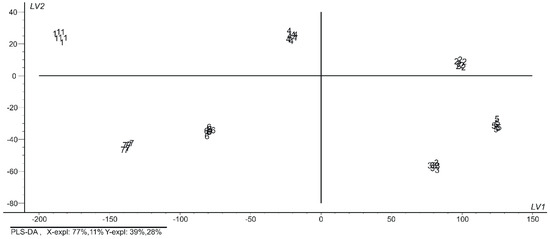 In order to confirm the existence of the seven categories observed in the PCA and DFA models and the classification error in both calibration and validation, PLS-DA was performed using the total cross validation method and an optimal number of latent variants (y in this case). As it may be seen in the PLS-DA scores plot (Figure 5), the seven groups are totally separated and only two latent components explain approximately the 94% of the information.
