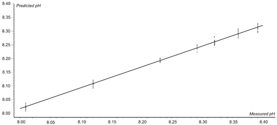 The graph of the correlation between the pH values predicted by the voltammetric sensors versus the values of the pH determined by the potentiometric method.