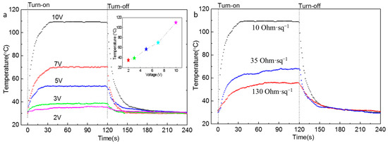 To demonstrate the applicability of the flexible transparent conductive AgNWs film in the field of TFH, we fabricated AgNWs films with sheet resistances of 10, 35, and 130 Ω∙sq−1 on PET substrates. The electrothermal performances of the AgNWs film heater were studied by applying direct current to the AgNWs films in a laboratory environment, as schematically illustrated in Figure 1b. Figure 6 shows a plot of temperature versus time for the AgNWs conductive film with a sheet resistance of 10 Ω∙sq−1 under the operation for input voltage from 2 to 10 V (Figure 6a) and for different sheet resistances with an input voltage of 10 V (Figure 6b). As shown in Figure 6a, when the input voltages were 5, 7, and 10 V, the electrical powers were 2.5, 4.9, and 10 W, respectively, and the film’s temperatures reached 57, 70, and 110 °C, respectively, confirming that the devices were able to operate with low input voltages. The experimental results indicate that the efficient transduction of electrical energy into Joule heating was caused by the good conductivity of the AgNWs film. Meanwhile, it is worth pointing out that, when the input voltage was in the range of 2–10 V, the film took less than 40 s to reach its steady-state temperature, demonstrating fast response of the AgNWs film heater. The results therefore demonstrate that the film is very suitable for applications in the field of the fast temperature switching with low input voltages. As shown in Figure 6b, when the input voltage was fixed at 10 V, the maximum steady-state temperature achieved increased when the sheet resistance of AgNW film was decreased. When the sheet resistance of the AgNWs film was 10, 35, or 130 Ω∙sq−1, the maximum steady-state temperature was 56, 67, or 110 °C, respectively; those values indicate that a sheet resistance of the film in the range of 10–35 Ω∙sq−1 is ideal for heating application and that the film exhibited good electrothermal conversion properties.
