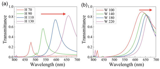 Figure 2. (a) Transmittance spectra at different heights (H) of the silver block: 70 nm (red), 90 nm (green), 110 nm (blue), and 130 nm (magenta). The width (W) and slot thickness (t) are fixed to 200 and 20 nm, respectively; (b) Transmittance spectra for different widths of the silver block: 100 nm (red), 140 nm (green), 180 nm (blue), and 220 nm (magenta). The height and slot thickness are fixed to 130 and 20 nm, respectively.