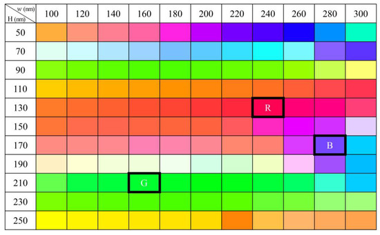Figure 3. Color table of all cases simulated using the finite-difference time-domain (FDTD) method. The width (W) and height (H) of silver blocks range from 100 to 300 nm and from 50 to 250 nm, respectively. Three black outlined boxes indicate three representative structures and the corresponding colors, red (R), green (G), and blue (B).