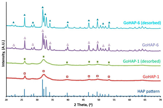Figure 1 shows X-ray diffraction line profiles for both sizes of GoHAP™. No phases other than hydroxyapatite were detected. Diffraction profiles for GoHAP™ before and after desorption are essentially identical, which indicates that the desorption process did not impact its crystallinity. The sharper peaks of GoHAP-6 (40 nm) demonstrate that the crystallite size of the latter is larger than that of GoHAP-1 (10 nm). Adsorption and desorption cycles also did not affect the Specific Surface Area and Skeletal Density of GoHAP™ nanoparticles (Table S2).
