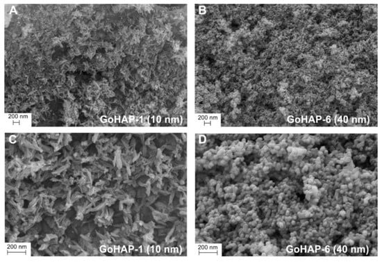 SEM image of GoHAP™ with different particle sizes of 10 nm (A,C) and 40 nm (B,D).