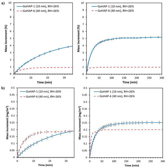 Kinetic curves of water adsorption on GoHAP-1 (10 nm) and GoHAP-6 (40 nm) with an ambient relative humidity of 26%: (a) percentage mass change, (b) mass increment per 1 m2 of GoHAP™.