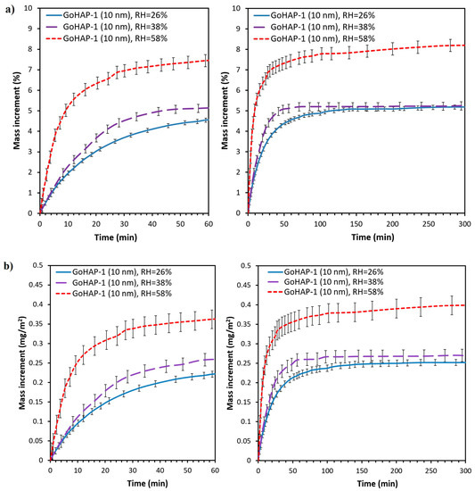 Regarding the impact of the water activity on the kinetics of adsorption, in the case of GoHAP-1 (10 nm), no difference was observed during the initial 10 min of exposure for a relative humidity of 26% and 38%. After that period at the ambient relative humidity of 38%, the mass increase is faster than for a relative humidity of 26% and reaches a state of equilibrium after 70 min. The saturated condition for the relative humidity of 26% is reached after 140 min. Despite differences in the adsorption kinetics, the quantity of water adsorbed by GoHAP-1 (10 nm) at the ambient relative humidity of 26% and 38% is similar and reaches slightly above 5% (Figure 6). At the ambient relative humidity of 58%, in turn, the water adsorption rate for the two initial stages of the process is considerably faster than at the lower relative humidity. Adsorption at the ambient relative humidity of 58% is 8.2%, e.g., 1.5 times higher than for 26% and 38% relative humidity. In other units for the surface, for a relative humidity of 58%, 0.4 mg of H2O is bound to 1 m2 on the GoHAP™ surface, while for 26% and 38% humidity, the value is about 0.25 mg of H2O/m2.