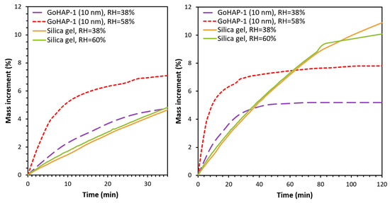 The kinetics of water adsorption of GoHAP™ was compared with a reference sample of silica gel. Samples were exposed for 2 h to the ambient relative humidity of 38 ± 2% and 58 ± 2% (Figure 7).