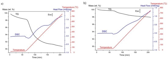 Thermogravimetry (TG) and calorimetry (DSC) curves of (a) GoHAP-1 (10 nm) and (b) GoHAP-6 (40 nm) soaked up to 800 °C. The temperature change as a function of time is also presented.