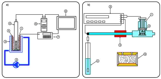 Scheme of (a) direct current conductivity measurement station: 1–nanofluid sample, 2–heater/refrigerator circulator, 3–water jacket, 4–heater, 5–conductivity probe, 6–conductivity meter, 7–heater controller, 8–computer with LabView software, (b) dielectric properties: 1–temperature stabilization chamber, 2–measuring cell holder, 3–heater, 4–column with compressed air, 5–impedance analyzer and temperature controller, 6–measuring cell.
