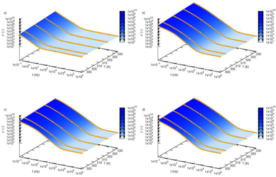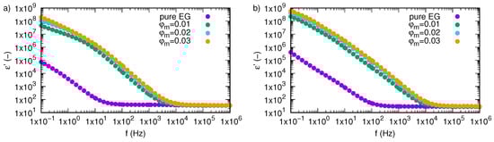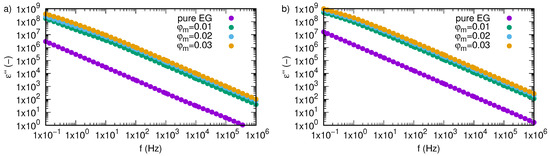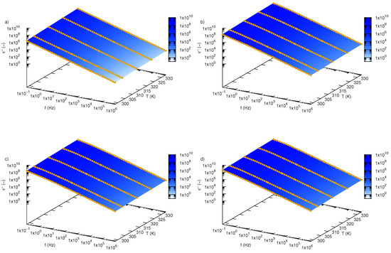 Figure 2 shows dependence of the real part of permittivity, ’, of SiO-L-EG nanofluids on frequency and temperature for all tested mass fractions and pure ethylene glycol. Behaviour of SiO-L-EG nanofluids under alternating external electric fields can be divided into two parts. In the low frequency region, a real part of permittivity strongly depends on the frequency of the electric field, while in the second region (higher frequencies), it is almost unaffected by frequency changing. Borders between these two areas are dependent on temperature and mass concentration of nanoparticles in ethylene glycol. Comparing permittivity of pure EG (Figure 2a) with SiO-L-EG nanofluids with various mass fractions (0.01—Figure 2b, 0.02—Figure 2c, 0.03—Figure 2d), it is clearly visible that the addition of SiO-L nanoparticles causes an increase in permittivity and shift border of these two regions towards higher frequency. The temperature effect is clearly noticeable for each tested sample. For better presentation of impact of both temperature and nanoparticle concentration on ethylene glycol properties, experimental results for all tested concentrations for two extrema investigated temperatures (298.15 and 333.15 K) are depicted in Figure 3. Based on the chosen experimental data (Figure 3), it is obvious that the addition of nanoparticles above 1 wt.% strongly affected the increase in permittivity of ethylene glycol. Furthermore, there is a more visible effect of conductivity in low frequencies, especially at lower temperatures.