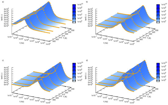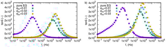 Dielectric loss tangents, tan, versus frequency and temperature are presented in Figure 6 for pure ethylene glycol and three tested fractions (0.01, 0.02, 0.03). All samples show peaks related to relaxation phenomenon. Localization of these peaks depend on the concentration of SiO-L nanoparticles and temperature. As the temperature rises, one can observe a shift relaxation peak towards higher frequencies. Huge displacement of relaxation peaks has a background in increasing mass fraction of silicon oxide lignin particles in ethylene glycol, which can be seen in Figure 7 where variation of the loss tangent as a function of frequency is depicted for two temperatures 298.15 K (Figure 7a) and 333.15 K (Figure 7b). Experimental data revealed that the relaxation process for pure ethylene glycol at 298.15 K occurs at approximately 5.4 Hz and increases in temperature up to 333.15 K to cause a shift to approximately 40.8 Hz. On the other hand, addition of SiO-L nanoparticles to ethylene glycol has a much stronger effect on displacement of relaxation peaks towards a higher frequency. Nanoparticle addition to base fluids causes approximately a two orders of magnitude shift of relaxation peak. Knowing relaxation frequency, one can calculate relaxation time, , using the following equation