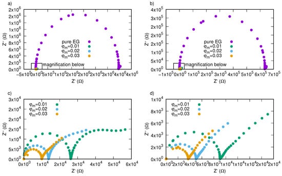 Figure 9 presents Nyquist plots for SiO-L-EG nanofluids with various mass fraction as a function of frequency and temperature. One can observe that measuring data are arranged in a semicircle for all investigated samples. The radius of these semicircles is strictly related to DC conductivity and is affected by both temperature and mass concentration of nanoparticles. Temperature effects on impedance values are most visible in case of pure ethylene glycol (Figure 9a), where an increase in temperature causes significant decrease in impedance. For the other samples, effect of temperature are also visible, but the intensity is lower. For better presentation of nanoparticle impact on impedance of silicon oxide lignin ethylene glycol experimental data of both real and imaginary impedance were depicted in Figure 10, where we can see a huge decrease in the radius of semicircles caused by the addition of SiO-L nanoparticles.