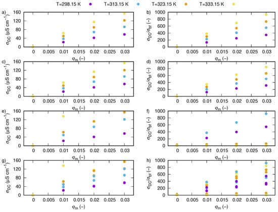Values of DC electrical conductivity vs. mass fraction for various temperatures for silicon oxide lignin nanofluids (a) calculated based on Nyquist plots (Figure 9 and Equation (2)), and (b) their enhancement, (c) calculated based on AC conductivity (Figure 13) and (d) their enhancement, (e) directly measured by DC conductivity probe and (f) their enhancement, (g) comparison of results obtained with different methods and (h) their enhancement.