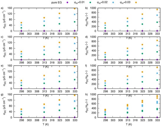 Values of DC electrical conductivity vs. temperature for silicon oxide lignin nanofluids with various mass fractions (a) calculated based on Nyquist plots (Figure 9 and Equation (2)), and (b) their enhancement, (c) calculated based on AC conductivity (Figure 13) and (d) their enhancement, (e) directly measured by DC conductivity probe and (f) their enhancement, (g) comparison of results obtained with different methods and (h) their enhancement.