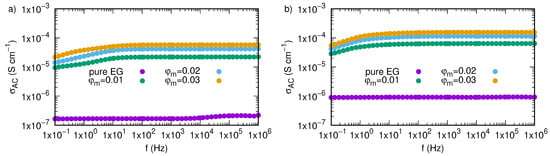 Dependence of AC electrical conductivity on frequency and temperature for pure ethylene glycol and nanofluids containing various mass fractions of SiO-L nanoparticles were plotted in Figure 13. We have shown that temperature has an impact on all samples, and an increase in temperature affects values of AC conductivity in all investigated frequency range. In the low frequency region, there is a slightly slope caused by electrode polarisation effect. Regions with constant values of AC conductivity, not dependent on frequency, are strictly related to DC conductivity. Occurrence of regions unaffected by frequency was also presented in Figure 14, where an effect of nanoparticles is more visible. Based on these areas, values of DC conductivity were calculated as average from values of AC conductivity between 10 Hz and 1 MHz. Results of these calculations are summarized in Table 3 and plotted in Figure 11b,d, where electrical conductivity and enhancement were presented, respectively. Obtained results also revealed electrical conductivity dependence on both mass fraction and temperature, moreover, they are consistent with the obtained methods (Table 2).