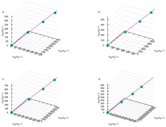 Comparison results of electrical conductivity enhancement obtained with three different methods for temperature: (a) 298.15 K, (b) 313.15 K, (c) 323.15 K, (d) 333.15 K; —electrical conductivity enhancement from direct measurements, —electrical conductivity enhancement calculated from plateau (Figure 13); —electrical conductivity enhancement calculated from Equation (2).