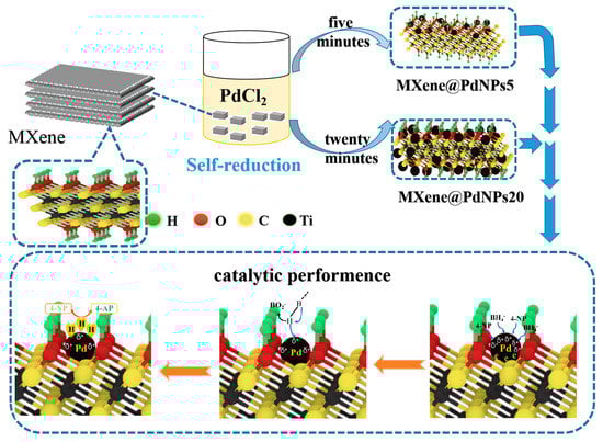 In this study, self-assembled MXene-Pd nanocomposites synthesized by a self-reduction strategy have high catalytic performance for nitro compounds and morin. First, a solution of PdCl2 (3 mL, 0.1 M) was slowly added to a suspension of MXene (100 mL, 1 mg/mL), and Pd2+ ions were reduced to form PdNPs, as shown in Figure 1. According to the reaction time, two kinds of MXene@PdNPs composites were produced, namely MXene@PdNPs5 and MXene@PdNPs20. Next, the catalytic activity of MXene@PdNPs for 2-NA, 4-NP and morin was studied. In this experiment, since the electrons in the low-valent titanium in MXene are oxidized to a high valence state, the electrons of the Pd2+ ions are reduced to PdNPs. On the other hand, MXene also provides an attachment site for Pd2+ reduction, so that the palladium nanoparticles can be well distributed on the surface of MXene, thereby reducing the aggregation of palladium. The catalytic mechanism for the catalytic reduction of p-nitrophenol is the transfer of electrons from the electron donor BH4− to the electron acceptor 4-NP. Specifically, in the solution, BH4− ions are first adsorbed on the surface of the catalyst. In the presence of BH4−, the 4-NP molecule decomposes and forms 4-nitrophenol ions due to the weak basicity of the sodium borohydride solution. After electron transfer to the metal catalyst, electrons of some PdNPs migrate to the MXene carrier, and the electron density of the PdNPs is changed by electron transfer. In addition, after electron transfer to the metal catalyst, hydrogen ions in the hydride spontaneously attacks the 4-NP molecule, and finally results in the in situ hydrogenation reaction of 4-NP with active H produces 4-AP [19]. Similarly, 2-NA contains a nitro group, which requires catalytic hydrogenation to be converted to an amino group like catalytic process of 4-NP, thus indicating that the catalytic mechanism of 4-NP and 2-NA is consistent. Since MXene-Pd nanocomposites have catalytic properties for 4-NP, they also have corresponding catalytic properties for 2-NA. The MXene-Pd nanocomposite has a good catalytic effect on the nitro compound because it catalyzes the hydrogenation of the nitro group into the amino group [20].
