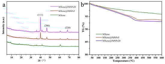 Thermogravimetric analysis (TG) is used to analyze the thermal stability of nanocomposites. It is an important technology for studying functional nanocomposites [24,25,26,27,28]. In order to study the thermal stability of the prepared MXene and MXene@PdNPs nanocomposites, the thermal properties of the obtained nanocomposites were characterized by thermogravimetric analysis. MXene and MXene@PdNPs nanocomposites were tested under nitrogen conditions, as shown in Figure 2b. The obtained three TG curves show that as the temperature increases, the heat loss of the material increases gradually [29]. When the temperature is 400 °C, the heat loss of the material is the largest—about 7.5%. After that temperature point, the loss tends to be flat. As shown in Figure S1b, the TG curve of MXene@PdNPs60 shows similar change tendency, indicating similar thermal stability of the synthesized composite materials.