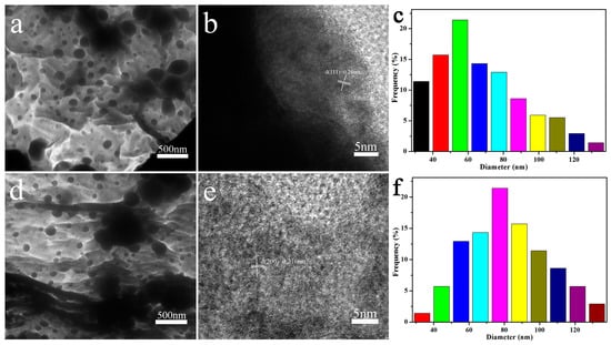 To further observe the structure of the prepared MXene@PdNPs complex, the TEM morphology is shown in Figure 3. The HRTEM image shows that the nanoparticles are single crystals. The interlunar spacing of (111) of pure PdNPs is 0.2243 nm (Figure S2). During the reduction of Pd by MXene, Pd particles grow slowly as the reaction time increases. The plane spacing d (111) = 0.240 nm and d (200) = 0.216 nm of the lattice data are clearly visible [20], as shown in Figure 3b,e. MXene is a new two-dimensional layered structure with higher visibility [30,31]. In addition, the size of the palladium particles corresponding to different reaction times is different. At 5 min of reaction, the particle size of the palladium particles in MXene@PdNPs5 was concentrated at 60 ± 5 nm as shown in Figure 3c. Further, as shown in Figure 3f, the particle diameter of the palladium particles in MXene@PdNPs20 is concentrated at 80 ± 5 nm. The experimental results show that the size of palladium particles increases with time, and the particle size of palladium particles of MXene@PdNPs60 composite is about 100 nm (Figure S3).