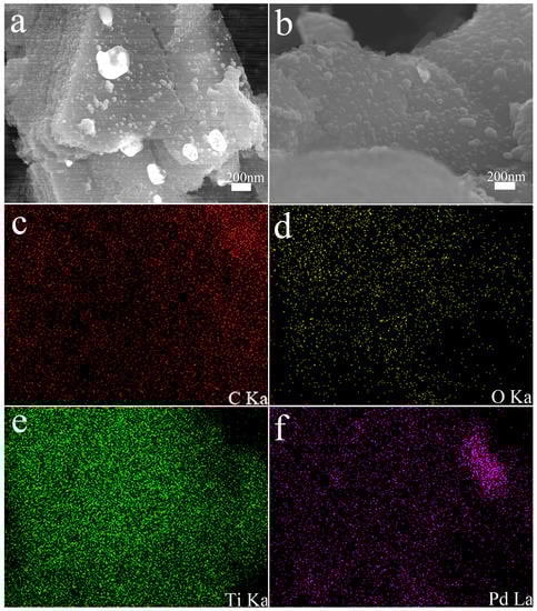 As shown in Figure 4, the morphology of the MXene@PdNPs complex was characterized by SEM. Figure 4a,b depict the SEM structures of MXene@PdNPs5 and MXene@PdNPs20. The different nanostructures with increased reaction time can be seen from the images, and the PdNPs particles anchored on the surface of MXene are uniformly dispersed. The particle size gradually increased, while the number of particles increased. However, when the reaction time was long (such as 60 min), it was easy to cause aggregation of Pd particles (Figure S4). Through the elemental mapping analysis in the SEM, as shown in Figure 3c–f, the mapped images of MXene@PdNPs clearly show the presence of carbon, oxygen, titanium and palladium elements, further confirming the surface and interlayer loading. But most palladium particles are mainly distributed on the MXene surface.