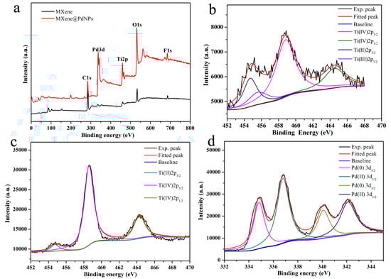 In addition, XPS is an effective tool to study the chemical state and element composition of various functional composites [32]. In order to study the mechanism of self-reduction, MXene and MXene@PdNPs20 composites were analyzed by XPS (Figure 5a). Ti (IV) 2p3/2 was assigned the obvious peak value of the original MXene sample at ~458.8 eV (Figure 5b). At the same time, the wide peak of 453.5–456.5 eV in Figure 5b indicates the existence of titanium with different valence states, including bivalent titanium at 454.8 eV and trivalent titanium at 455.8 eV [33,34,35,36,37,38,39]. In addition, in the self-reduction process of the composite material MXene@PdNPs20 (Figure 5c), the divalent titanium and trivalent titanium can be partially converted into tetravalent titanium (from 68% to 96% calculated from cumulative area of XPS peaks scanned from sample surface). As shown in Figure 5d, the binding energy of 334.8 eV and 340.1 eV corresponds to the Pd3d5/2 and the Pd3d3/2 component of the metal Pd(0) state with 44% percent calculated from cumulative area of XPS peaks, which confirms the presence of metal Pd [40]. In addition, the combined energy of 336.8 eV and 342.1 eV represent the divalent Pd(II) state with 56% percent calculated cumulative area of XPS peaks, suggesting the slight adsorption of PdCl2 salt on surface of MXene@PdNPs20 composite.
