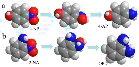 Spatial filling models of 4-NP transforming to 4-AP (a) and 2-NA transforming to OPD (b).