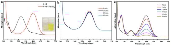 UV-vis absorption curves of 4-NP before and after adding NaBH4 aqueous solution (a); catalytic reduction of 4-NP with MXene (b) and PdNPs (c).