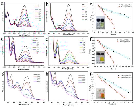 Catalytic reduction of 4-NP, 2-NA and morin by MXene@PdNPs5 composite material (a,d,g) and MXene@PdNPs20 composite material (b,e,h), respectively; (c,f,i) represent the corresponding relationship between the catalytic time and ln(Ct/C0) under different catalysts.