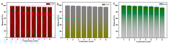 The cyclic catalytic capacity of MXene@PdNPs20 composite for the reduction of 4-NP (a), 2-NA (b) and morin (c).