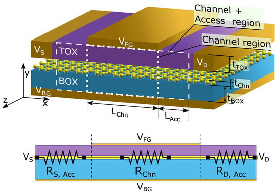 A schematic depiction of the physical structure of the simulated GFET is shown in Figure 1. The graphene flake is sandwiched in between a top insulator layer, with thickness and dielectric permittivity , and an insulating substrate, with thickness and dielectric permittivity . Both oxides are assumed thick enough as to neglect any tunnelling current through them. A four-terminal device is considered, with a front gate extending over a length (the device channel length), giving rise to two under-lapped regions of length (the access region length) that connect it with the source and drain terminals. The back gate, when considered, extends all along the structure including the channel as well as the access regions. , , and stand for the front gate, back gate, and drain terminal biases respectively, while the source terminal, , is assumed to be grounded. The total resistance of this structure, , can be schematically split into the series combination of three resistances corresponding to the source access region (), the channel region () and the drain access region ().