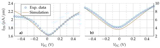To assess the capability of the numerical simulator to reproduce and explain the experimental results, we have first validated it against the devices fabricated in [29,30]. Both are GFETs based on monolayer graphene embedded between a SiO layer, which acts as a substrate, and a YO layer, which acts as a front gate dielectric. In both cases, this YO layer is 5 nm thick while the substrate is 300 nm thick in [29], and 286 nm thick in [30]. For the device presented in [29], the distance between the source and drain contacts is 1.5 m and the front gate length is 600 nm, while in [30] the device is 8.2 m long and its front gate is 7 m long. In other words, in both experimental devices the gate contact does not cover the whole region between source and drain contacts, thus creating two symmetrical under-lapped regions at both channel edges; namely, the device access regions. To reproduce the data reported in [29], the same mobility is assumed for both types of carriers, electrons and holes () with a value of 90 cmVs, and a puddle charge density of 7 cm is considered. N-type chemical doping of 10 cm is defined for the graphene layer. To account for the graphene-metal contact resistances, which are in series with the total resistance of the structure, , we include two additional 100 nm long N-type doped regions (5 cm) in both source and drain ends [31]. The back gate is grounded and is set to 0.1V. To fit the data presented in [30], the values used are 1091 cmVs, cm and the graphene layer chemical doping is set to 10 cm. The back gate is also grounded and is set to 0.05 V. The experimental and simulated transfer characteristics are shown in Figure 2a [29] and Figure 2b [30]. The simulated I-V characteristics match very accurately with the experimental results in the whole range of biases and are able to catch the transfer response of the electron and hole branches, especially in Figure 2b.