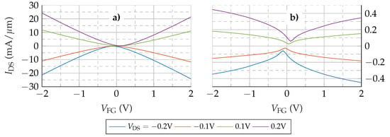 Next, the GFET including the access regions is investigated. The resulting transfer characteristic is shown in Figure 3b. Comparing Figure 3b and Figure 3a, a marked variation of the GFET response is observed. First, there is a notable decrease in the values of , around a factor ×100. Second, the transfer characteristic shows a saturation trend for high which resembles much better the experimental response. Third, and more important, the characteristic is no longer symmetric with respect to , though the mobility is identical for both kinds of carriers.