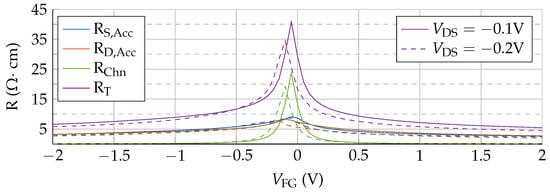 Resistance of the three device regions (channel, source and drain access regions) compared with the total resistance as a function of the gate potential, for two values: −0.1 V (solid) and −0.2 V (dashed).