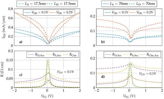 As expected, there are significant differences between devices. Shortening either the source or the drain access regions results in a higher output current (Figure 5a) and reduces both its saturation and its asymmetry with respect to the elongated scenario (Figure 5b). When comparing the shorter regions (Figure 5a) it is clearly observable that the = 17.5 nm device (solid lines) has a more symmetric response than the = 17.5 nm (dashed lines). This is more evident for = 0.1 V and emphasizes the role of the source access region with respect to the drain access region. An equivalent conclusion can be achieved from the elongated devices (Figure 5b). The longer results in an increased asymmetry between both branches. These results can be explained by analysing the resistances of the structure. Figure 5c,d show , and as a function of for = 0.1 V. When any access region is shortened (Figure 5c), its resistance is similar or lower than the channel resistance regardless . The longer region resistance controls the total current (except for close to zero). When one of the regions is enlarged this effect is emphasized. The transfer responses in Figure 5b are clearly saturated due to the dominant role in the total conductivity of the longer access region.