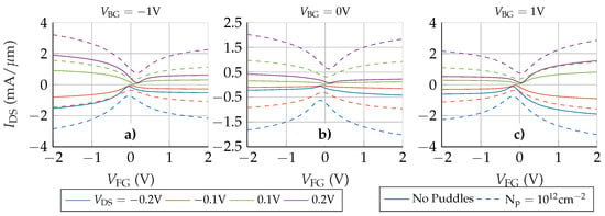 characteristics of the complete structure when three different back gate potentials are used (−1 V (a), 0 V (b) and 1 V (c)). Solid lines correspond to the device without puddles and dashed lines to the device with cm.