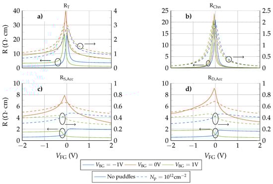 Total (a), channel (b), source (c) and drain (d) resistances for different back gate biases and 0.1 V. Solid lines (referred to the left axis) correspond to the no puddles scenario while dashed lines (referred to the right axis) depict the values obtained when a puddle concentration of cm is considered.