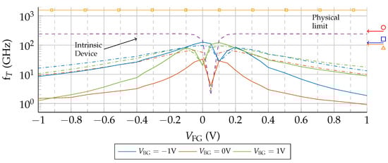 Figure 8 shows as a function of under two scenarios: no puddles (solid lines) and cm (dash-dotted lines). To assess the impact of the access regions, the performance of the intrinsic device (structure indicated by the dotted rectangle in Figure 1) is depicted too (dashed lines). In addition, to evaluate the magnitude of the calculated values, the experimental measurements of reported in [35] and [36] are indicated by the arrows on the right side axis of Figure 8. Despite the device structure and the bias conditions are different, the channel lengths of these experimental devices are similar to the ones simulated here (144 nm [35] and 140 nm [36]), and therefore constitute a good reference. Importantly, a de-embedding procedure was carried out for the RF measurements of these experimental devices by using specific “short” and “open” structures with identical layouts in order to remove the effects of the parasitics associated with the pads and connections, but not the contact and access region resistances.