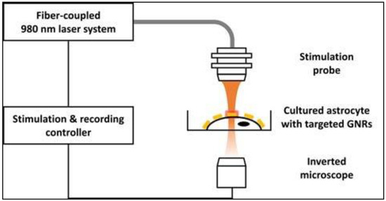 Eom at al. [33] developed a local AuNR delivery system, based on surface-modified AuNRs, to investigate the effects of the activation of the PNF surface on intracellular Ca2+ transients in astrocytes. To ensure the precise delivery of the AuNRs to the astrocyte plasma membrane, the AuNR surface was decorated with streptavidin. This tagging system relies on the tendency of biotinylated anti-Thy-1 antibodies to conjugate with thymocyte antigen 1 (Thy-1) on the surface of astrocytes. Thy-1 is an astrocyte–specific protein commonly expressed this type of cells and hence, can be used as a target/marker protein. The IR stimulation system implemented throughout this study involves a laser controller, an optical fiber (diameter: 600 μm; numerical aperture: 0.14) coupled with a laser diode (980 nm), and a stimulation probe, as shown in Figure 3. To ensure precise laser illumination, the incident laser beam’s position was determined by a red guiding beam through the optical microscope.