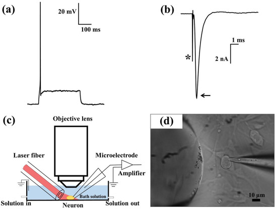 The typical response of a healthy neuron, held by whole-cell patch clamping, when exposed to certain stimuli. (a) A single action potential caused by a depolarizing current injection; (b) fast sodium currents during membrane depolarization in voltage-clamp (arrow). The stimulating electrode artifact is indicated with an asterisk. (c) The experimental setup for simultaneous laser stimulation and whole-cell patch clamp recordings on a neuron. (d) Phase-contrast image showing a patched neuron. Right: microelectrode; left: optical fiber. Reproduced with permission from [23]. John Wiley and Sons, 2014.