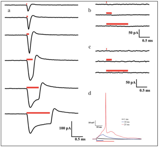 The patch-clamp recording showed unique waveform generation in the presence of AuNRs compared to silica-coated gold nanospheres and the control (cell alone). A noticeable difference in membrane current flow in response to different laser pulse durations was observed (Figure 6). The cells alone, compared to the cells exposed to AuNRs (Figure 6b,c), showed lower levels of, or no observable membrane current, when irradiated with varying pulse durations. The membrane depolarization of the neurons exposed to plasmonic nanoparticles always started at the onset of PNF activation. The action potential of the AuNRs-neuron was directly evoked by a single, 25-ms duration laser pulse, while subthreshold depolarizing potentials were seen at 1 and 10 ms laser pulses (Figure 6d).