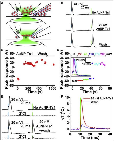 Optical stimulation of DRG neurons with AuNP-Ts1. (A) The same procedure used with non-functionalized AuNPs could not wash AuNP-Ts1 off of the cell. (B) At first, DRG neurons responded only to electrical stimuli (blue bars: 500 pA, 1 ms), but adding AuNP-Ts1 made the neurons sensitive to optical stimuli (green bars: 174 mW, 532 nm, 1 ms). (C) Even after 20 min of continual washing, AuNP-Ts1-labeled neurons were still optically sensitive. (D) Increasing the laser power increased cell depolarization. As a result, action potentials were triggered when the cell’s threshold voltage was reached. 174 mW was the required voltage to reliably stimulate this particular neuron. Inset: sample traces for each laser power. (E) Without AuNP-Ts1 (top 2 traces), no temperature changes were seen 2 mm away from a DRG cell during both electrical (blue bar) and optical (green bar) stimulation. However, when AuNP-Ts1 were added and excess nanoparticles were washed away (bottom 2 traces), optical stimulation was able to measurably increase the temperature. Temperature traces are single recordings with noise subtraction and are filtered at 1 kHz. (F) When nanoparticles were in the bulk solution (before washing), a significant temperature change was seen. After active perfusion washing, only the nanoparticles tightly bound to the surface were left. The cell was still optically excitable, but the temperature change 2 mm from the cell decreased dramatically (Green bar shows the optical stimulus). Reproduced with permission from [38]. Elsevier, 2015.